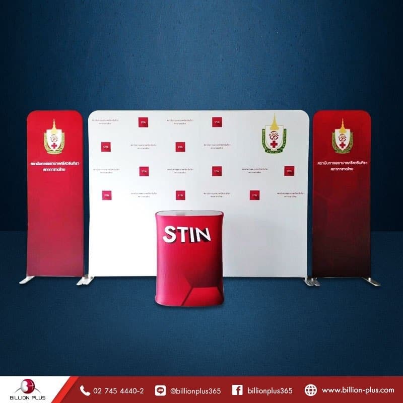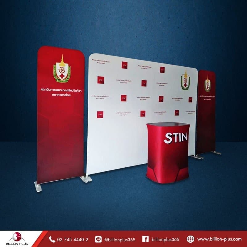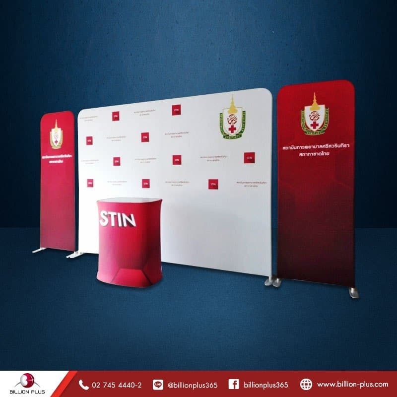 2. แบนเนอร์ผ้า Fabric Banner แบนเนอร์ที่นำมาประกอบกับบูธเคลื่อนที่, ชุดแบคดดรอปผ้า เพื่อเติมเต็มให้กับอุปกรณ์ออกบูธสำเร็จรูป ดฝโดยปกติมักจะนิยมนำมาจัดวางด้านซ้ายและขวา Portable Fabric Display เน้นย้ำแบรนด์และโลโก้เพื่อให้สะดุด เด่นชัด เรียกความสนใจ กับผู้พบเห็น แบนเนอร์แบบผ้ามีหลายขนาดความกว้างเริ่มตั้งแต่ 40 เซนติเมตรเป็นต้นไป ส่วนความสูงของ Fabric System ก็สูง2.30 เมตรเท่ากันกับแบคดรอปผ้าแต่สามารถสั่งให้ลดระดับ จะสูง ต่ำ เราผลิตให้ตามตามความประสงค์